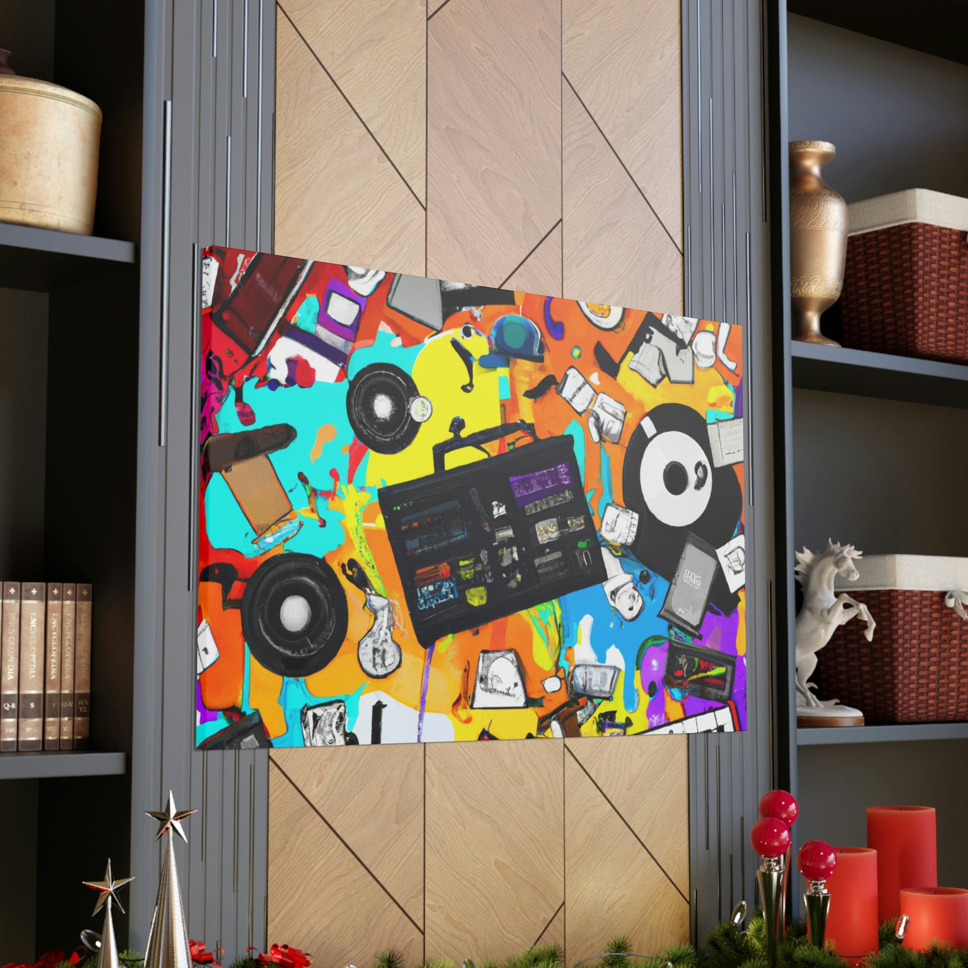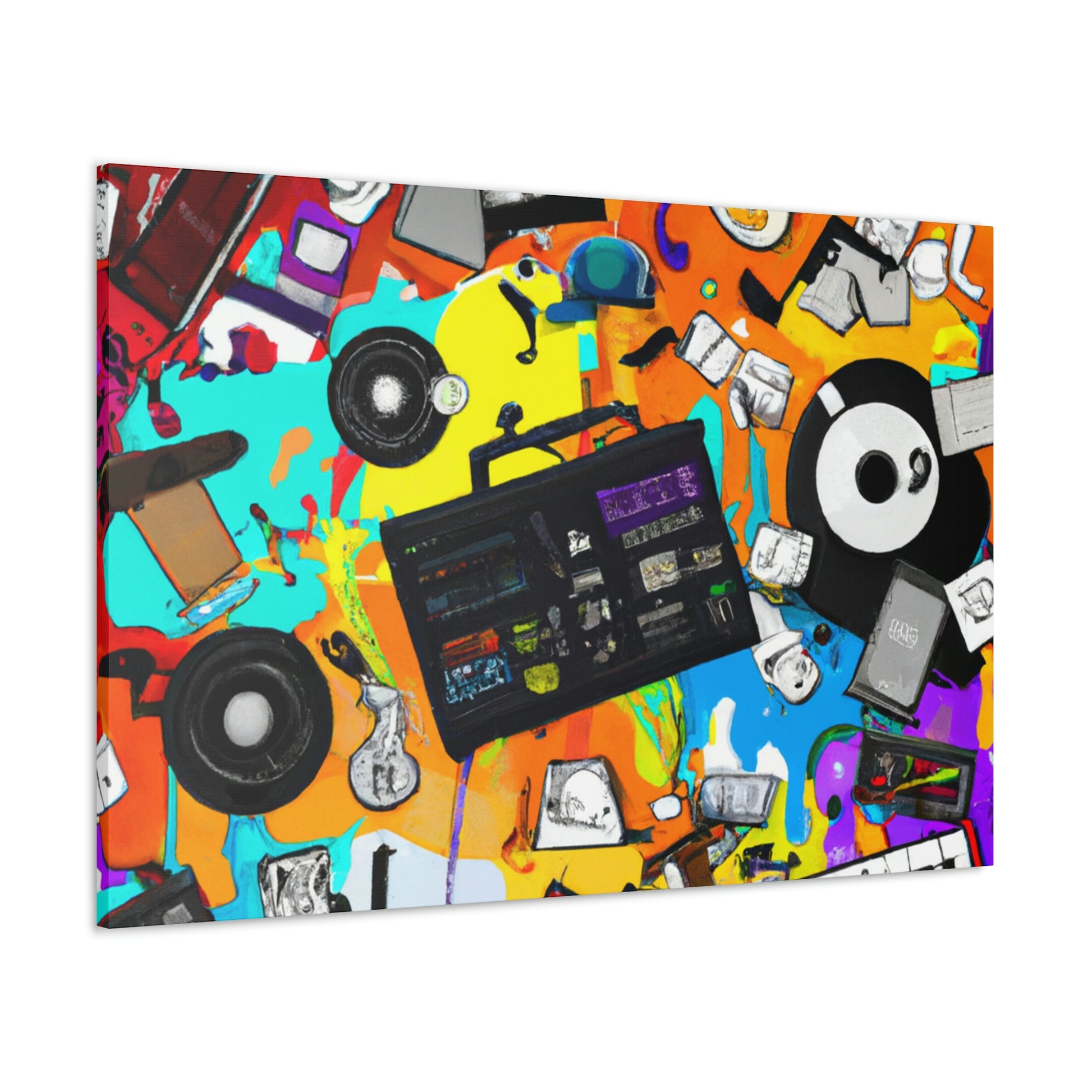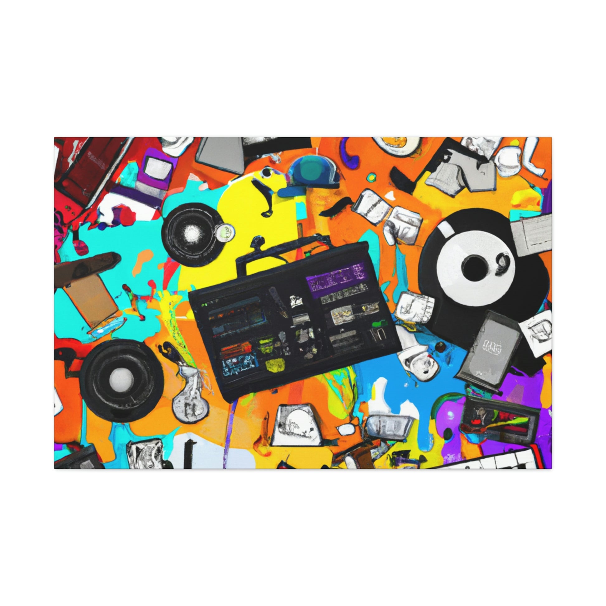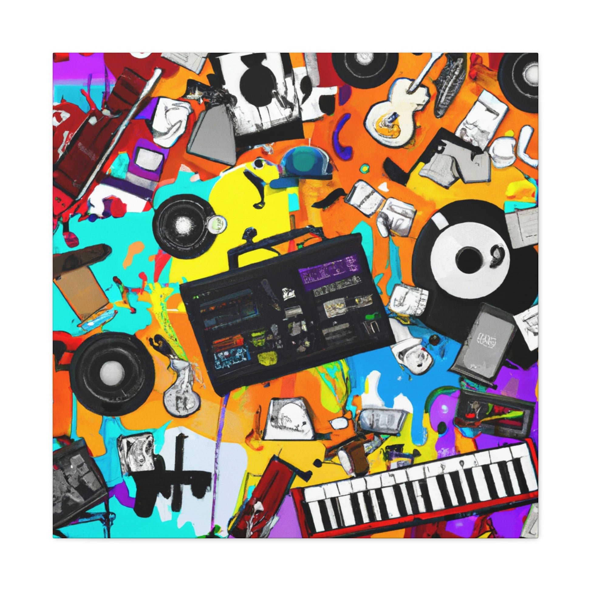 This vibrant graffiti-style canvas is sure to bring a pop of culture to your home or studio. The bold colors and iconic music production tools, like a classic turntable and drum machine, along with the captivating symbols will symbolize a life-long love of music. Invite a newfound respect for the tools and art that made musical history with this one-of-a-kind piece! #music #art #murals #decor #canvas #muralart #musicproducer #vibrant #graffiti #symbols #turntables #drummachine #music